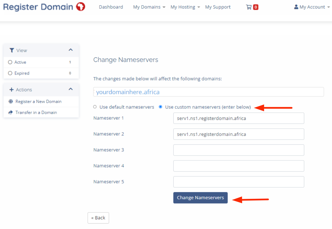 4.) Select the option "Use My Own Custom Nameservers" remove the present nameservers and replace them with the ones provided in your welcome document.