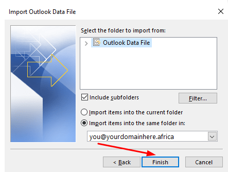5.7.) Choose the entire Outlook Data File, then select "Import items into the same folder" and lastly specify the email address in question.