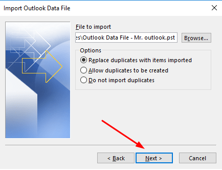 5.6.) Locate your PST in question by clicking on "browse", select "Replace duplicates with items imported" and then select "Next"