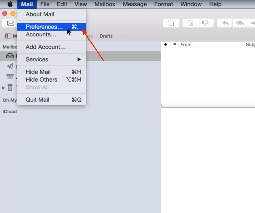 2.) Select "Mail" on the top left-hand corner of your screen and choose "Preferences" from the dropdown list.